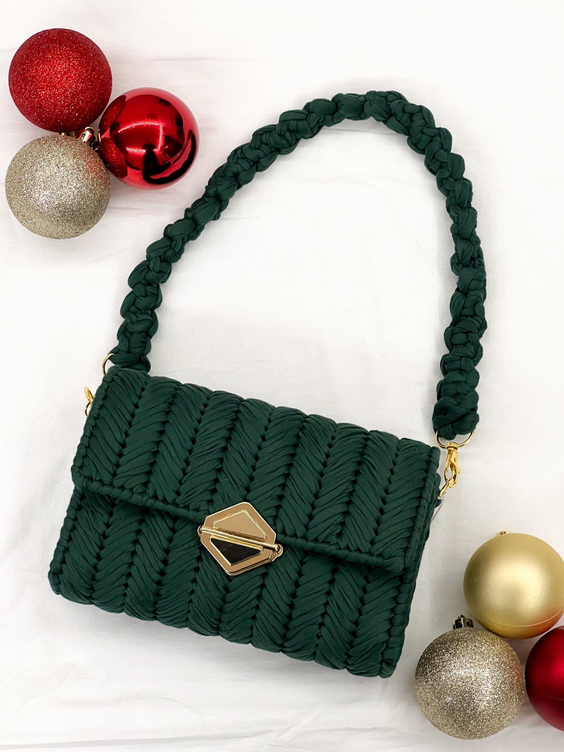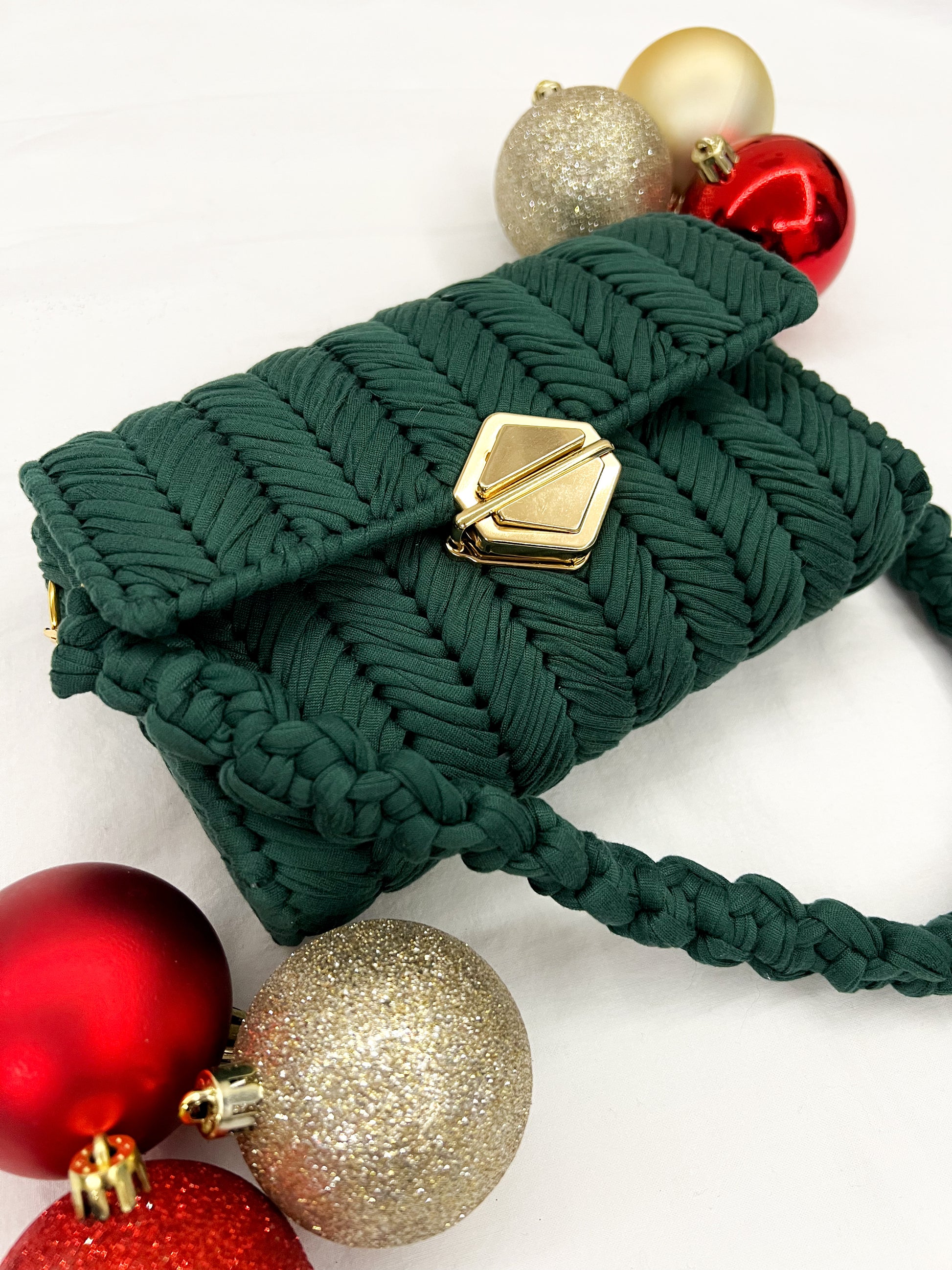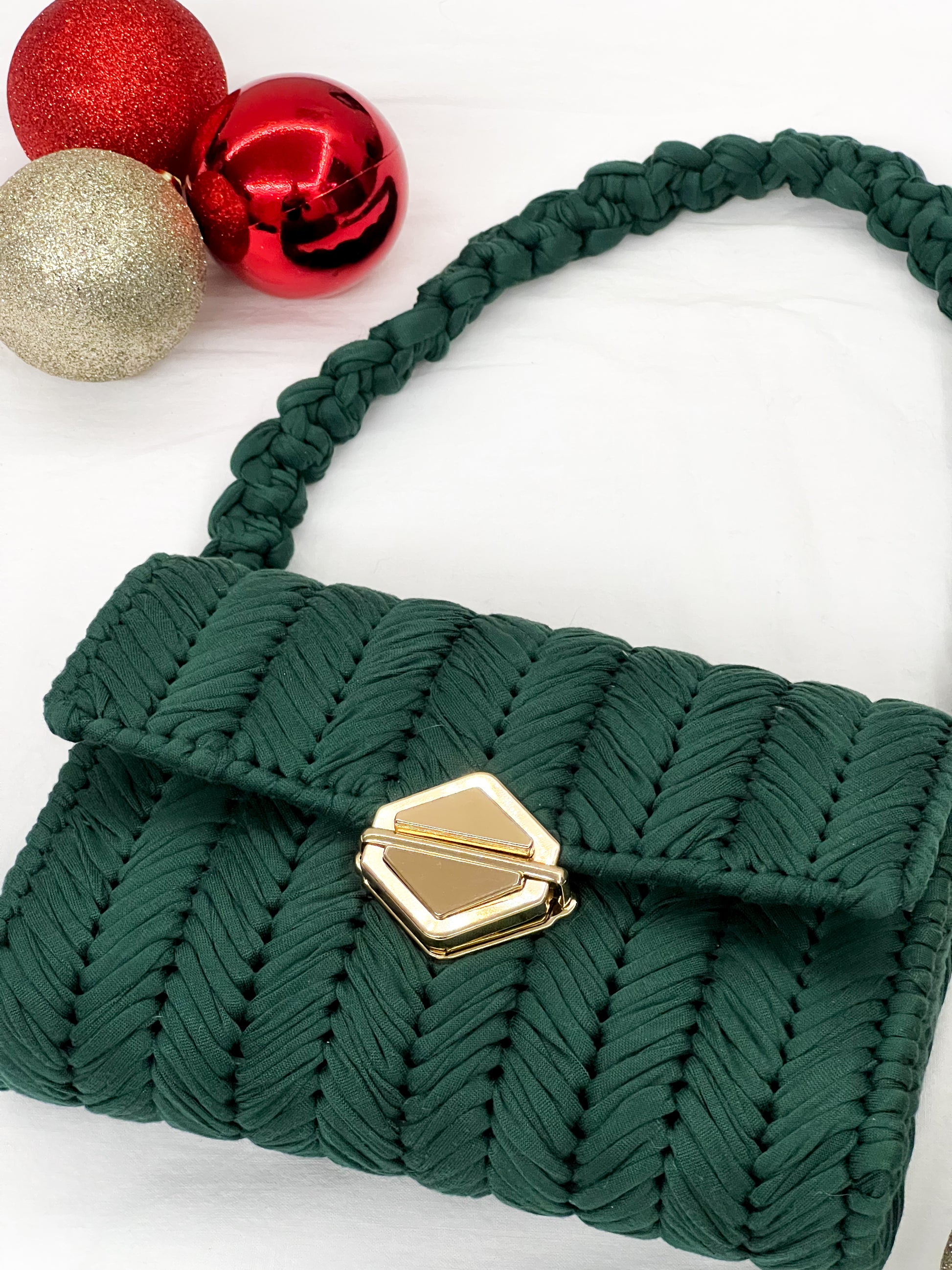 Håndlaget clutch veske med gulldetaljer og avtagbar skilderreim