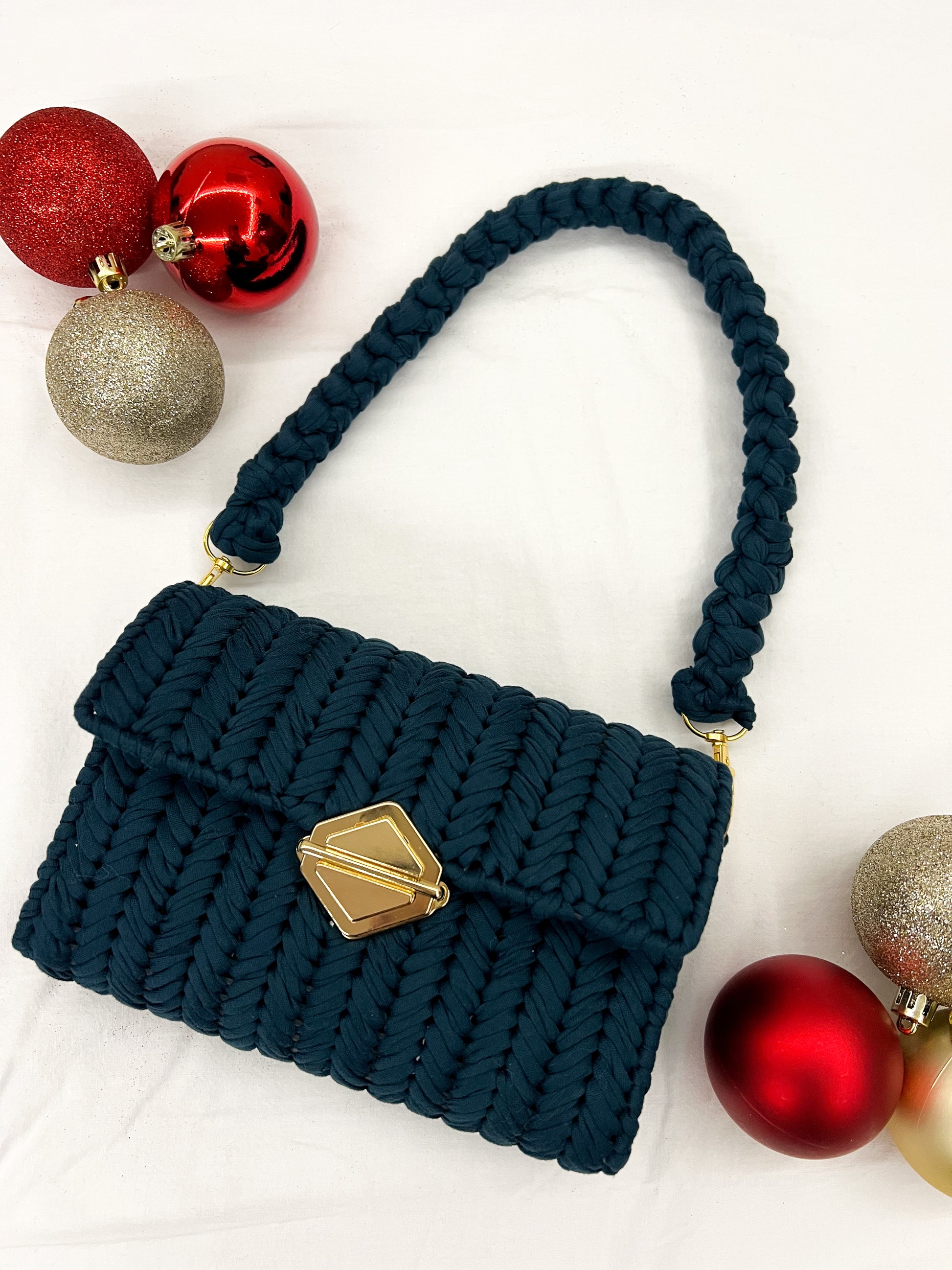 Håndlaget clutch veske med gulldetaljer og avtagbar skilderreim